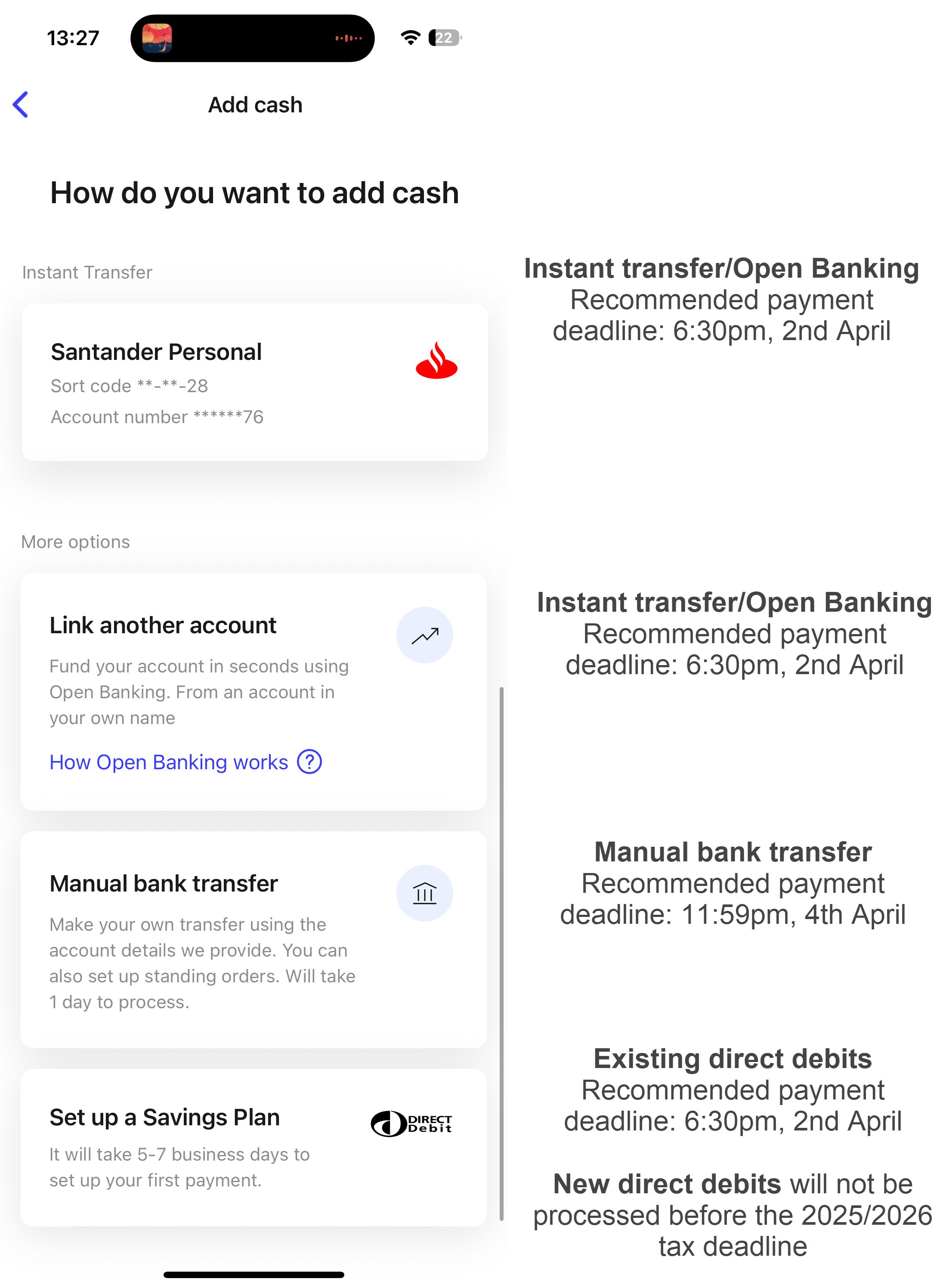 | Direct debit | Deposits received by InvestEngine by the 2nd April 18:30. | Direct debits processed by us before this time will count for 2025/26. After this time, we will not process direct debits again until the new tax year, due to bank holidays. |